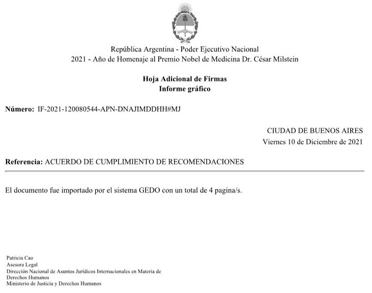 VISTO el Expediente N° EX-2021-120059355-APN-SDDHH#MJ, la Ley N° 23.054 y el “ACUERDO DE CUMPLIMIENTO DE RECOMENDACIONES” del 23 de noviembre de 2021, firmado entre el Gobierno de la REPÚBLICA ARGENTINA y el peticionario, en el marco del Caso N° 13.117 del Registro de la COMISIÓN INTERAMERICANA DE DERECHOS HUMANOS (CIDH), y