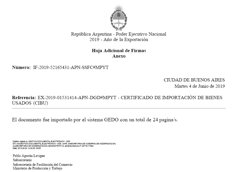 2. Asimismo, la SECRETARÍA DE COMERCIO EXTERIOR del MINISTERIO DE PRODUCCIÓN Y TRABAJO, a través de sus áreas técnicas con competencia en la materia, será la autoridad a cargo de la emisión y suscripción de los Certificados de Importación de Bienes Usados (CIBU) para su presentación ante la DIRECCIÓN GENERAL DE ADUANAS dependiente de la ADMINISTRACIÓN FEDERAL DE INGRESOS PÚBLICOS, entidad autárquica en el ámbito del MINISTERIO DE HACIENDA, al momento de oficializarse la destinación definitiva de importación para consumo del bien usado alcanzado por la presente medida.