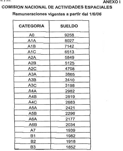 Como consecuencia de lo dispuesto en el párrafo que antecede se establecen los montos por categoría correspondientes al Sueldo del personal de la Comisión Nacional de Actividades Espaciales con vigencia a partir del 1º de junio de 2006 y del 1º de agosto de 2006 con el alcance que se detalla en los Anexos I y II respectivamente de la presente acta.