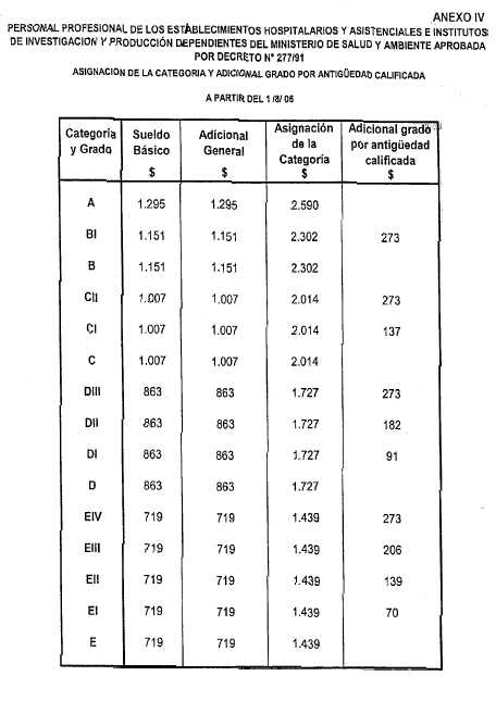 Como consecuencia de lo dispuesto en el párrafo que antecede se establecen los montos correspondientes al Sueldo Básico; Adicional General; Asignación de la Categoría; Adicional Grado por Antigüedad Calificada; Funciones Jerarquizadas; Suplemento por Dedicación Exclusiva, para el Personal Profesional de los Establecimientos Hospitalarios y Asistenciales e Institutos de Investigación y Producción dependientes del Ministerio de Salud y Ambiente con vigencia a partir del 1º de junio de 2006 y del 1º de agostó de 2006 con el alcance que se detalla en los Anexos I a VI respectivamente de la presente acta.