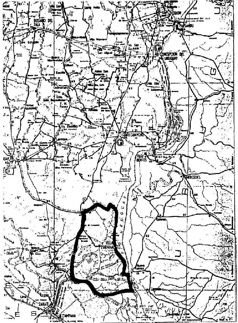 Río Paraná Guazú (límite entre las provincias de BUENOS AIRES y ENTRE RIOS) desde su desembocadura hasta la ruta nacional Nº 12 y por la misma hasta su encuentro con la ruta nacional Nº 14. Por esta última hasta el cruce con el río Gualeguaychú y por este río hasta la intersección con el camino que une Santa Rosa con La Clarita. Por este camino hasta La Clarita y por vías del Ferrocarril General Urquiza (Km. 322,5) hacia Arroyo Barú hasta San Salvador. Desde esta localidad por línea recta hasta el punto de reunión de los límites interdepartamentales de Colón, Concordia y Villaguay. Desde este punto por el Límite Concordia-Villaguay, luego Concordia-Federal, Federación-Federal y hasta intersección con Ruta Nacional Nº 127 y por ésta hacia el Norte hasta su intersección con la Ruta Nacional Nº 14. Desde este cruce (Cuatro Bocas) por la Ruta Nacional Nº 119 hasta Mercedes y desde allí por Ruta Provincial Nº 40 hasta Colonia Carlos Pellegrini. Desde este punto, por Ruta Provincial Nº 41 hasta la intersección con Ruta Provincial Nº 37 y desde allí por líneas rectas a las localidades de Loreto y Nuestra Señora del Rosario de Caa Catí para continuar por la Ruta Provincial Nº 5 hasta San Luis del Palmar y desde allí, por Ruta s/n a Paso de la Patria.