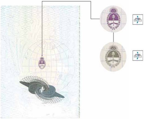 Cuando la lámina de alta seguridad del Pasaporte se inclina respecto del eje vertical y horizontal, algunos elementos del diseño parecen moverse para adentro o para afuera, dependiendo de la dirección de la inclinación.