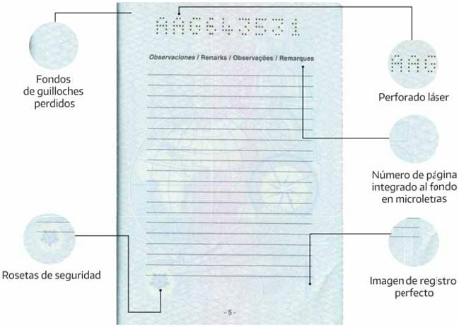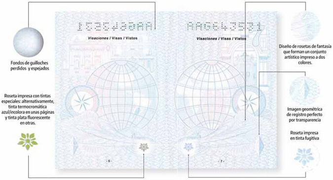 Las páginas 5 a 28 y de la 31 a 32, adicionalmente, contienen rosetas al igual que una imagen geométrica y el perforado láser con el número de pasaporte.