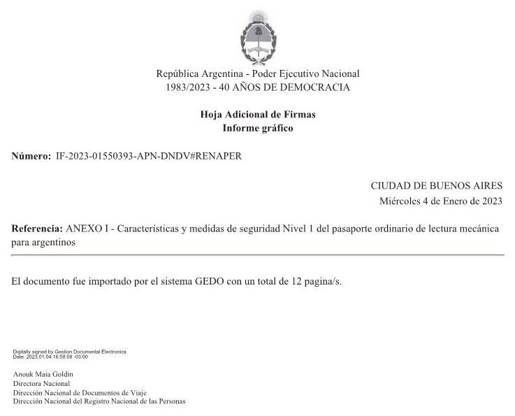 ARTÍCULO 1°.- Apruébanse las características y medidas de seguridad de Nivel 1 del Pasaporte Ordinario de Lectura Mecánica para Argentinos, emitidos por esta DIRECCIÓN NACIONAL DEL REGISTRO NACIONAL DE LAS PERSONAS, organismo descentralizado actuante en la órbita de la SECRETARÍA DE INTERIOR del MINISTERIO DEL INTERIOR, que como Anexo I (IF-2023-01550393-APN-DNDV#RENAPER), forma parte integrante de la presente medida y que como Anexo VI (IF-2023-01550393-APN-DNDV#RENAPER) se incorpora a la Disposición N° 904 del 25 de septiembre de 2021 de esta Dirección Nacional.