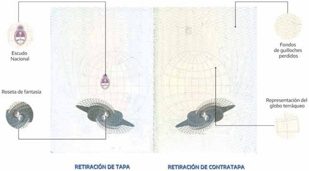 La retiración de la tapa y contratapa está impresa en offset y calcografía, presentando fondos con guilloches perdidos a DOS (2) colores. Cuentan con una roseta de fantasía impresa en DOS (2) colores, con relieve perceptible al tacto.