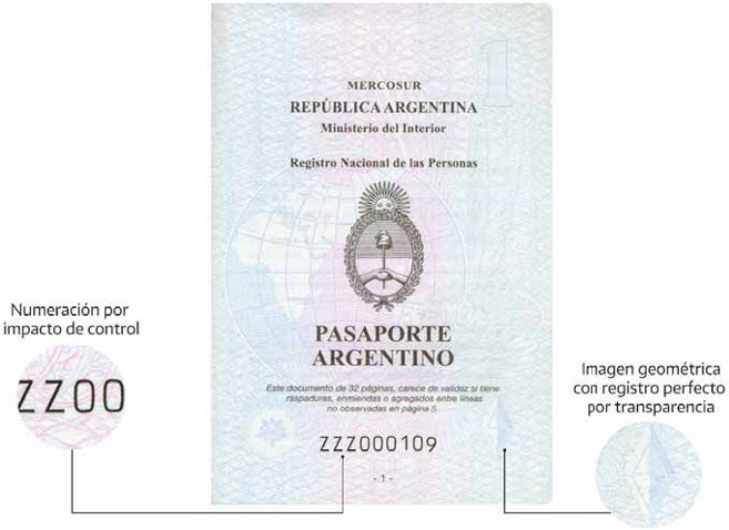 En la primera página se encuentran impresos en offset los siguientes textos: “MERCOSUR” - “REPÚBLICA ARGENTINA” - “Ministerio del Interior” - “Registro Nacional de las Personas” sobre el Escudo de la República Argentina. Luego siguen las leyendas “PASAPORTE ARGENTINO” - “Este documento de 32 páginas, carece de validez si tiene raspaduras, enmiendas o agregados entre líneas no observadas en página 5”.