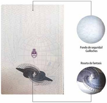 Los fondos de las páginas interiores (páginas 5 a la 28 y de la 31 a la 32), tienen guilloches perdidos y espejados, impresos a DOS (2) colores en tintas fijas (uno de ellos irisado y el otro en tinta fugitiva). Asimismo, cuentan con un diseño de rosetas de fantasía que forman un conjunto artístico impreso a DOS (2) colores (uno fijo irisado y otro fugitivo).