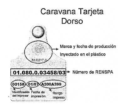 2 Dorso de la hembra: Se deberá grabar el número de RENSPA del productor que solicitó las caravanas, bajo el formato determinado por la Disposición Nº 955/2004 de la Dirección de Agroquímicos, Productos Farmacológicos y Veterinarios, identificación del impresor, mes y año de impresión y rango de la tanda impresa (código inicial y final). El tamaño mínimo de cada carácter será de CINCO MILIMETROS (5 mm.).
