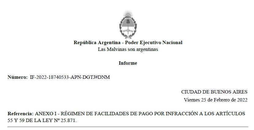 Que mediante la Disposición DNM N° 2201/10, se aprobó el “Régimen de Facilidades de Pago de Multas por Infracción a los artículos 55 y 59 de la Ley N° 25.871”, la cual fue modificada por las Disposiciones DNM N° 1602/12 y DNM N° 4653/16.