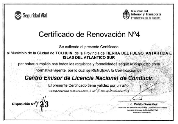 ARTICULO 1° — Renuévase la Certificación del Centro de Emisión de Licencias Nacional de Conducir del Municipio de TOLHUIN, de la Provincia de TIERRA DEL FUEGO, ANTARTIDA E ISLAS DEL ATLANTICO SUR a fin de expedir la Licencia Nacional de Conducir por el plazo de un (1) año en los términos del artículo 4° inciso f) del Anexo I al Decreto 1716/2008.