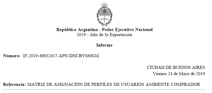 ARTÍCULO 4°. – Modifícase la matriz de asignación de perfiles aprobada por el artículo 6º de la Disposición de la OFICINA NACIONAL DE CONTRATACIONES N° 65/2016, por la que como Anexo registrado en el Módulo Generador de Documentos Electrónicos Oficiales bajo el número IF-2019-49032457-APN-DNCBYS#JGM, forman parte integrante de la presente Disposición.