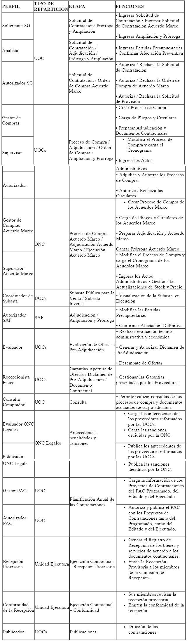 Que asimismo por la Disposición de la OFICINA NACIONAL DE CONTRATACIONES N° 65/2016 se aprobaron, el Manual de Procedimiento del COMPR.AR, las Políticas, Términos y Condiciones de uso del Sistema (PCTUS) comunes a todos los usuarios, el Procedimiento de Registro y Autenticación de los usuarios de los proveedores, el Procedimiento de Registro y Autenticación de los usuarios de la administración y la Matriz de asignación de perfiles de usuarios ambiente comprador.