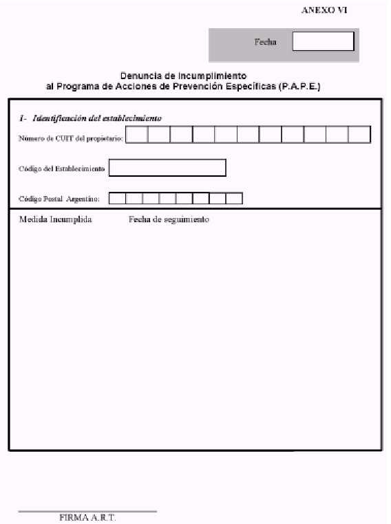 Art. 10. — Con la información obtenida y la relevada en las correspondientes visitas a los establecimientos del empleador, las Aseguradoras de Riesgos del Trabajo deberán completar, respecto de cada establecimiento PyME, el Formulario de "Estado de Cumplimiento en el Establecimiento de la Normativa Vigente" incluido en el ANEXO IV a esta Resolución y elaborar un Programa de Acciones de Prevención Específicas (P.A.P.E.), conforme a lo aprobado en el ANEXO V a la misma.