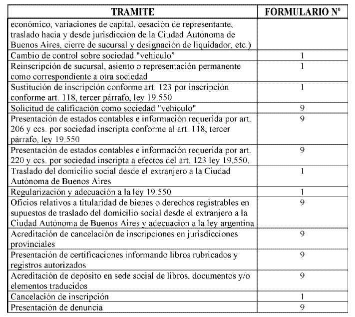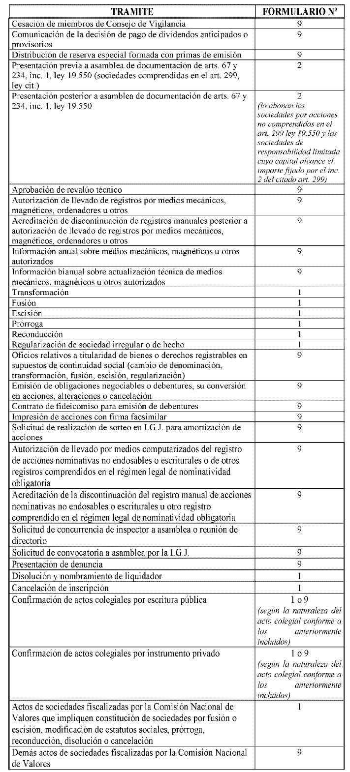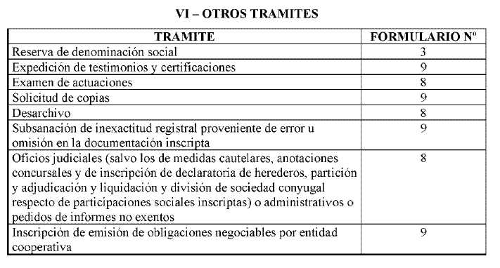Los trámites no previstos en la tabla que antecede, oblarán el arancel correspondiente al formulario nº 9.