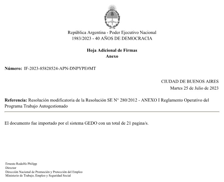 ARTÍCULO 1°.- Sustitúyese el ANEXO I - Reglamento Operativo del PROGRAMA TRABAJO AUTOGESTIONADO de la Resolución de la SECRETARÍA DE EMPLEO N° 280/2012 y sus modificatorias, por el ANEXO I identificado como Documento Electrónico Nº IF-2023-85828524-APN-DNPYPE#MT, que forma parte integrante de la presente Resolución.