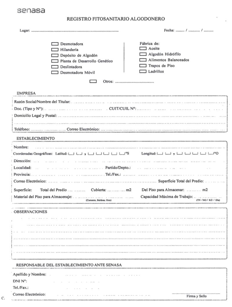 Inciso a) Formulario de solicitud de inscripción en el Registro Fitosanitario Algodonero que, como Anexo I, forma parte integrante de la presente resolución.