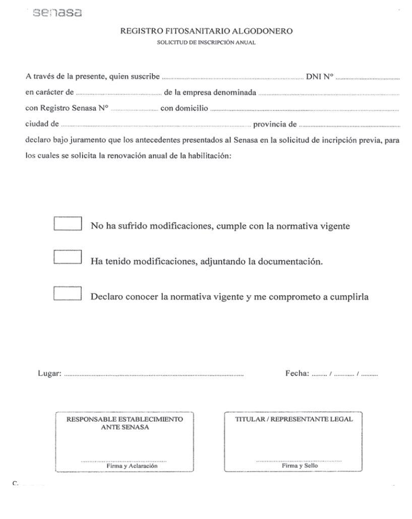 ARTÍCULO 8° — Renovación de la inscripción anual. Requisitos. Para renovar la inscripción anual en el Registro Fitosanitario Algodonero los interesados deben presentar en la Oficina del SENASA correspondiente a su jurisdicción o en los sitios indicados por los Centros Regionales y/o la Dirección Nacional de Protección Vegetal, la siguiente documentación: