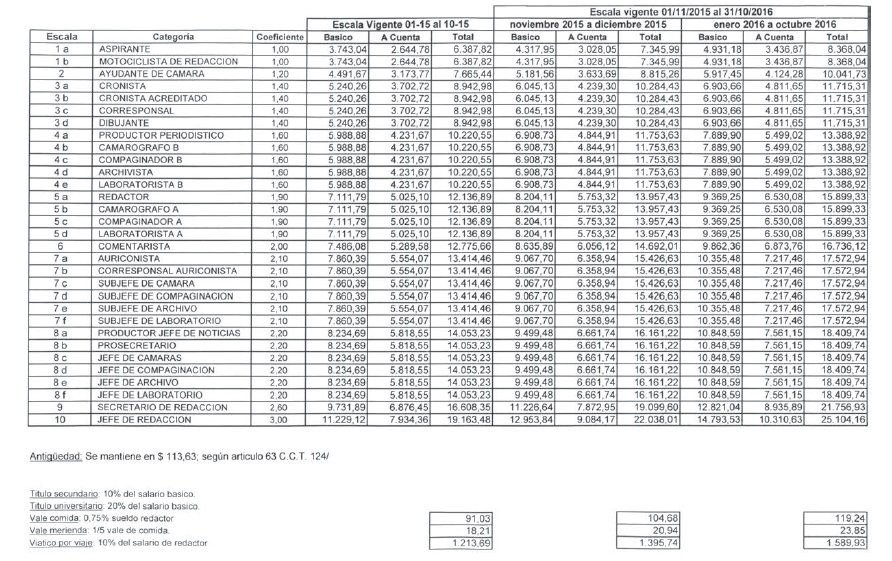 Se adjunta como Anexo I la escala salarial vigente y las nuevas remuneraciones a partir del 01 de noviembre de 2015 y hasta el 31 de octubre de 2016. Dichos incrementos serán liquidados bajo los conceptos; Básicos 60% y “A cuenta de futuros aumentos” el 40% restante de dicho aumento.