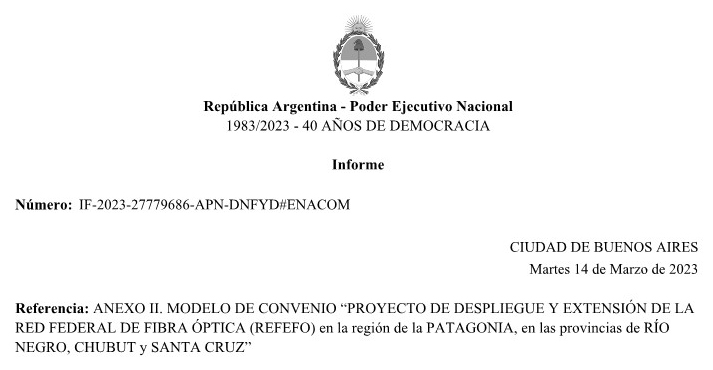 ARTÍCULO 4°.- Apruébase el Modelo de Convenio que se encuentra registrado en el GENERADOR ELECTRÓNICO DE DOCUMENTOS OFICIALES como IF-2023-27779686-APN-DNFYD#ENACOM, que deberá suscribir la EMPRESA ARGENTINA DE SOLUCIONES SATELITALES SOCIEDAD ANÓNIMA (C.U.I.T. N° 30-70967041-3) con el ENACOM para la ejecución del “PROYECTO DE DESPLIEGUE Y EXTENSIÓN DE LA RED FEDERAL DE FIBRA ÓPTICA (REFEFO) en la región de la PATAGONIA, en las provincias de RÍO NEGRO, CHUBUT y SANTA CRUZ”, aprobado por el Artículo 1°, que como ANEXO II forma parte integrante de la presente Resolución.