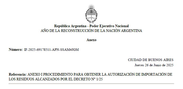 ANEXO I PROCEDIMIENTO PARA OBTENER LA AUTORIZACIÓN DE IMPORTACIÓN DE LOS RESIDUOS ALCANZADOS POR EL DECRETO N° 1/25.