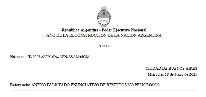 ARTÍCULO 11.- Apruébese el listado enunciativo de residuos no peligrosos que como Anexo IV N° IF-2025-65793694-APN-SSAM#JGM forma parte integrante de la presente resolución. El mismo podrá ser actualizado y/o modificado por la SUBSECRETARÍA DE AMBIENTE conforme a los antecedentes generados de autorizaciones emitidas y en base a la evidencia científica técnica o nuevas normas que se dicten en la materia.