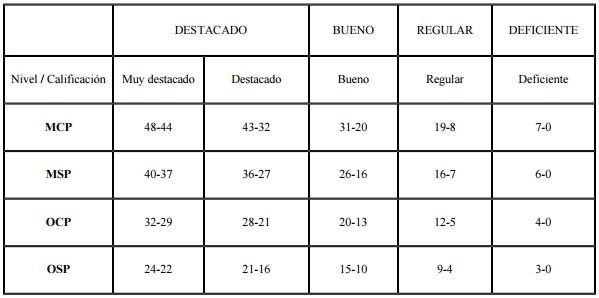 En lo que respecta al puntaje a asignar a cada uno de los factores a evaluar y como consecuencia de la sumatoria de los valores asignados a los mismos, el puntaje final obtenido y la calificación que le corresponderá, se acuerda homologar la tabla de conversión de puntajes aprobada en el Anexo III de la Resolución de la ex-SFP N° 21/93, la cual se expone a continuación: