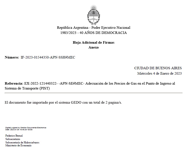 Que, en el sentido expuesto, debe señalarse que el costo del Gas importado de Bolivia derivado del contrato entre ENERGÍA ARGENTINA SOCIEDAD ANÓNIMA. (ENARSA), y YACIMIENTOS PETROLÍFEROS FISCALES BOLIVIANOS (YPFB), se estima en el orden de los 9,91 U$S/MMBTU para el año 2023.