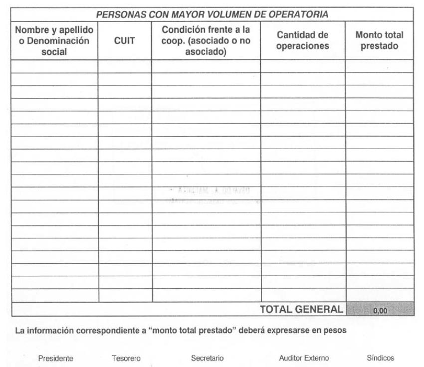 ARTICULO 9°.- La cooperativa deberá remitir mensualmente la nómina de las VEINTE (20) personas, incluyendo asociados y no asociados, con mayor volumen de operatoria en el período, indicando asimismo la cantidad de operaciones que generaron el monto total prestado. Para ello deberá remitir el cuadro que como Anexo VI forma parte integrante del presente acto administrativo.