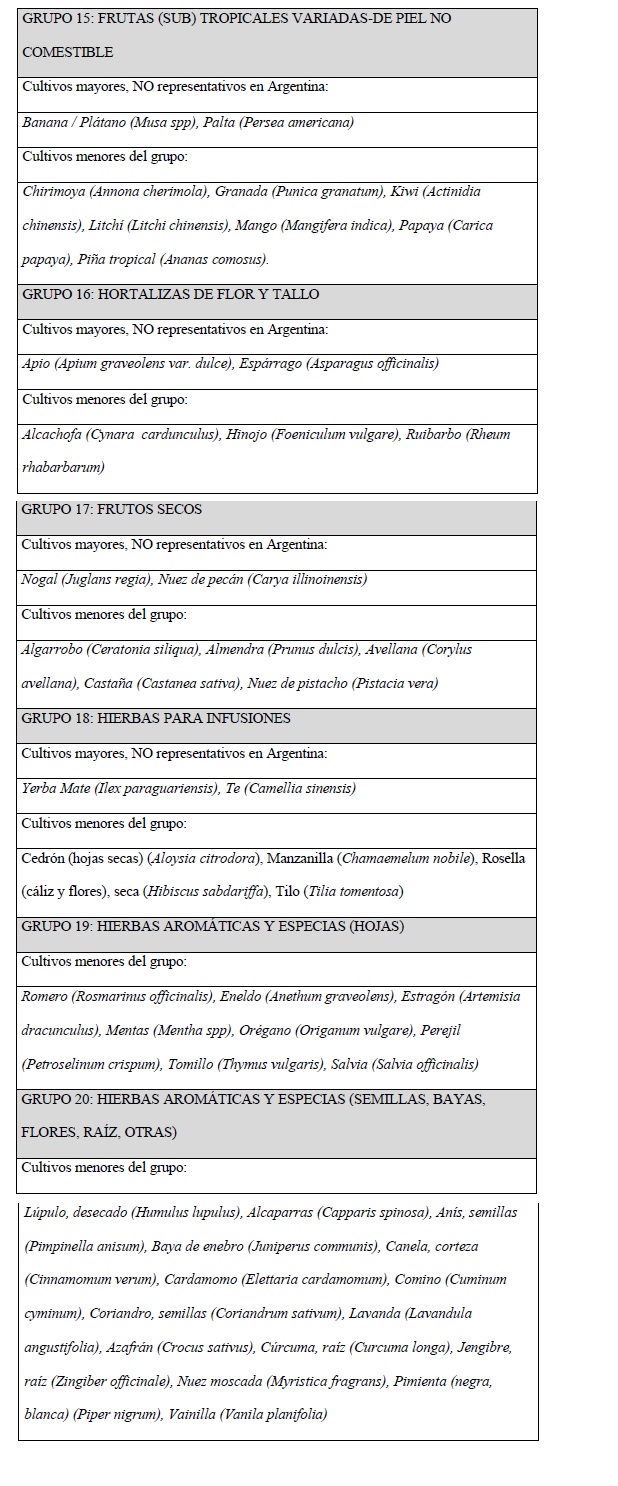 ESTABLECIMIENTO DE RESIDUO POR GRUPOS DE CULTIVO Y POR ESPECIE VEGETAL EN CULTIVOS MAYORES NO REPRESENTATIVOS EN ARGENTINA: