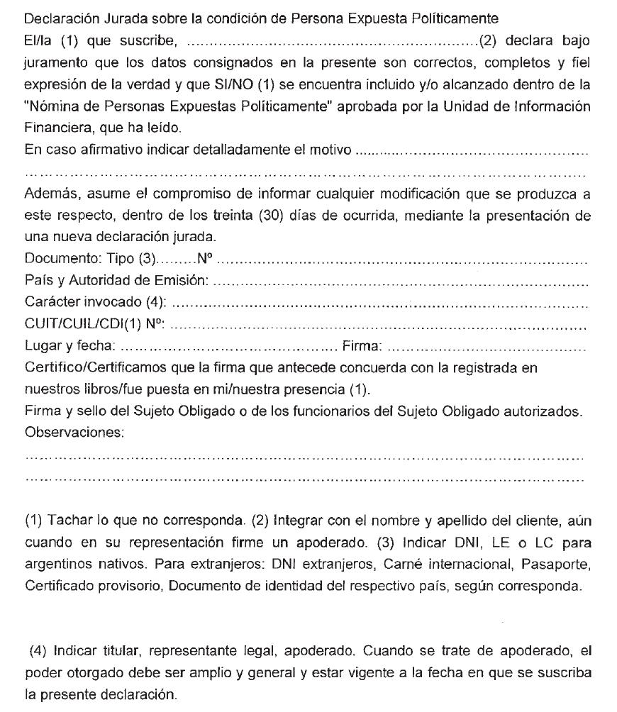 Nota: Esta declaración deberá ser integrada por duplicado, el que intervenido por el sujeto obligado servirá como constancia de recepción de la presente declaración para el cliente. Esta declaración podrá ser integrada en los legajos o cualquier otro formulario que utilicen habitualmente los Sujetos Obligados para vincularse con sus clientes.