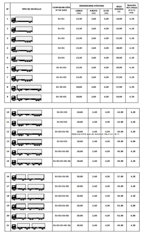 2. Los pesos máximos, establecidos por la Ley, que los vehículos pueden transmitir a la calzada y las configuraciones que los complementan se presentan en la siguiente tabla: