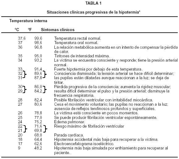 Entre los trabajadores, las exposiciones fatales al frío han sido casi siempre el resultado de exposiciones accidentales, incluyendo aquellos casos en que no se puedan evadir de las bajas temperaturas ambientales o de las de la inmersión en agua a baja temperatura. El único aspecto más importante de la hipotermia que constituye una amenaza para la vida, es el descenso de la temperatura interna del cuerpo. En la Tabla 1 se indican los síntomas clínicos que presentan las víctimas de hipotermia. A los trabajadores se les debe proteger de la exposición al frío con objeto de que la temperatura interna no descienda por debajo de los 36° C (96,8° F). Es muy probable que las temperaturas corporales inferiores tengan por resultado la reducción de la actividad mental, una menor capacidad para la toma racional de decisiones, o la pérdida de la consciencia, con la amenaza de fatales consecuencias.