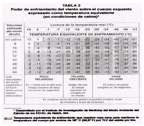 En la Tabla 2 se da una gráfica de temperaturas equivalentes de enfriamiento en la que se relacionan la temperatura del aire medida con termómetro de bulbo seco y de la velocidad del viento. La temperatura equivalente de enfriamiento se debe usar al estimar el efecto combinado de refrigeración del viento y de las bajas temperaturas del aire sobre la piel expuesta o al determinar los requisitos de aislamiento de la ropa para mantener la temperatura interna del cuerpo.