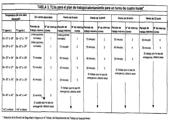 En la Tabla 3 se indican los límites recomendados para trabajadores vestidos de manera apropiada durante períodos de trabajo a temperaturas por debajo del punto de congelación.