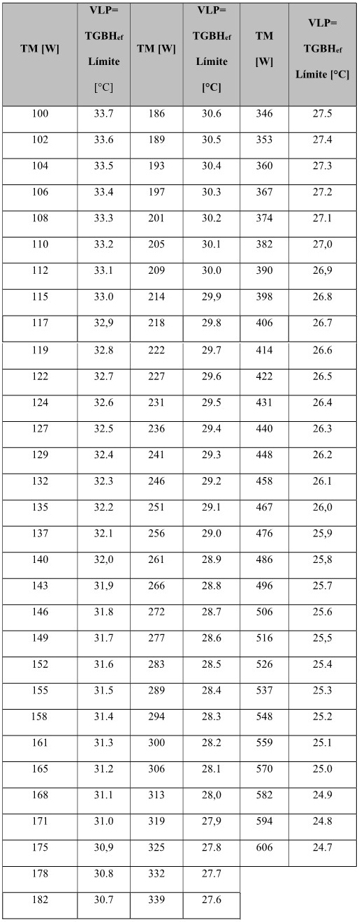 A: TGBH límite en zona de descanso. Se considera un valor de 33.7 para una TM ≤ 100W (Si la TM es superior se deberá recurrir a la Tabla 8, ingresando por la columna de TM se obtiene el TGBH límite para dicha TM).