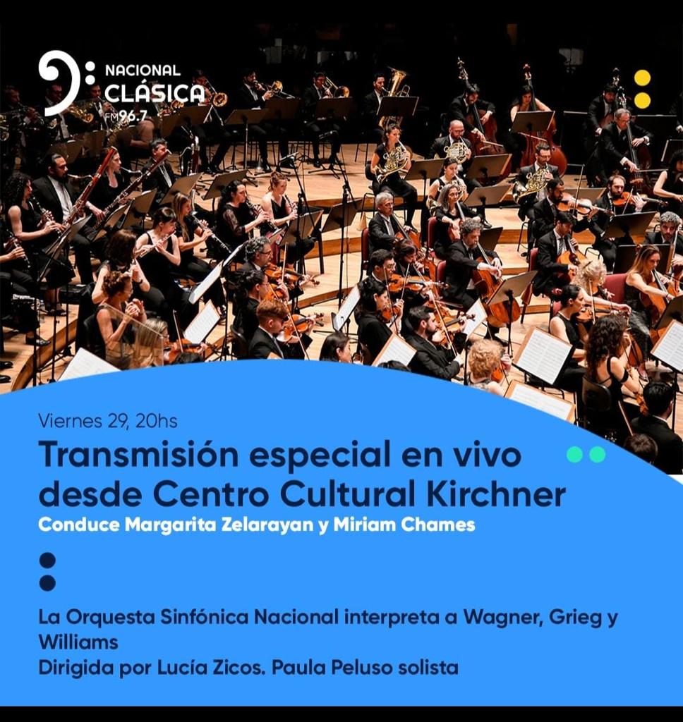 La Orquesta Sinfónica Nacional interpreta a Wagner, Grieg y Williams. Dirección musical: Lucía Zicos - Solista: Paula Peluso Piano. Conducción: Margarita Zelarayan y Miriam Chames.