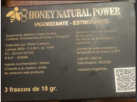 - Suplemento dietario a base de miel, marca HONEY NATURAL POWER, Vigorizante - Estimulante, RI: 20/32515313/0, RNE: 500085, Elaborado por: Pablo Campos, Larraya 3600 - CABA, cp 1439”, en cualquier presentación, lote y fecha de vencimiento.