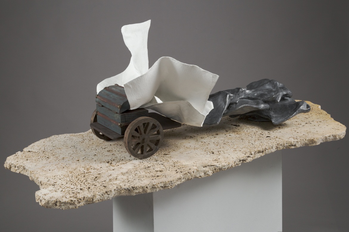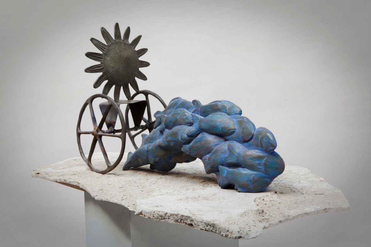 Completan la serie 5 “carros” imaginarios cuyas ruedas en escala definitiva serán de verdaderos carros antiguos que han recorrido nuestros campos, nuestras calles, significando el devenir, el traslado hacia otros lugares, el avance de la historia. Cada carro es tirado por cardúmenes de peces de distintas especies. El pez como testigo silencioso del tránsito doloroso de tanta humanidad proveniente de diferentes partes del mundo, impulsados por la hambruna, las guerras, el horror. Necesitaron emprender la desgarrante aventura de migrar hacia lo desconocido, hacia estas tierras donde encontraron suelo propicio para sembrar nuevamente la esperanza.