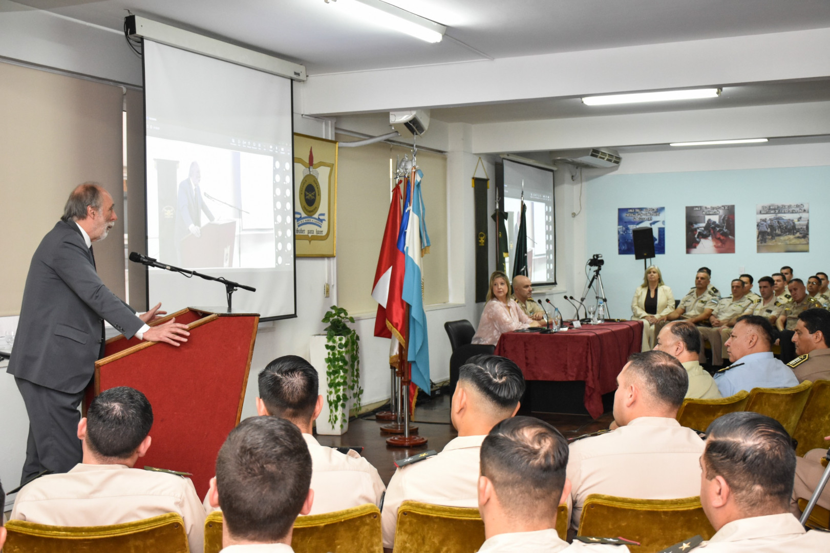 Estuvieron presentes, además, de manera presencial los Oficiales becarios de la Prefectura Naval Argentina, de la Policía Nacional del Perú y de Carabineros de Chile, junto a los Oficiales de la Fuerza e integrantes de los Cursos de regulares dictados en el Instituto.