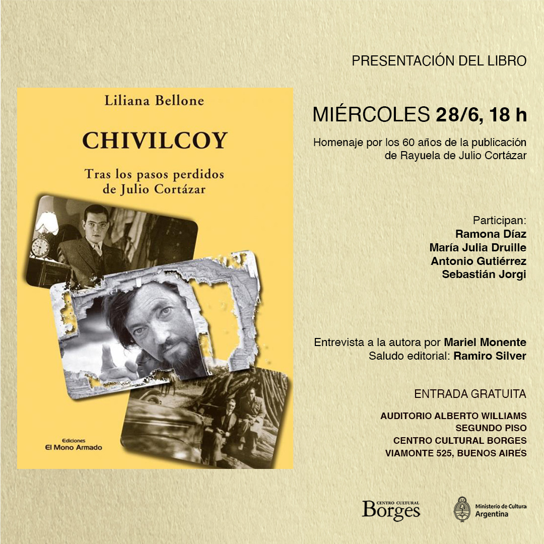 El Centro Cultural Borges del Ministerio de Cultura de la Nación invita a la presentación del libro Chivilcoy. Tras los pasos pérdidos de Julio Cortázar, de Liliana Bellone, a 60 años de la publicación de Rayuela, de Julio Cortázar.