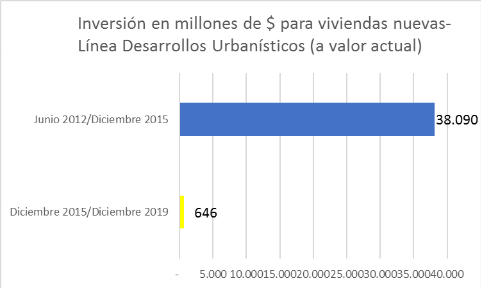 Durante la última Presidencia de Cristina Fernández de Kirchner (específicamente, entre junio de 2012 y diciembre de 2015) se invirtieron U$S 2.922 millones ($38.090 millones a valores actuales) en la línea Desarrollos Urbanísticos de PROCREAR, con el objetivo de construir un total de 30.010 viviendas en 79 predios distribuidos en distintos puntos del país. En contraste, durante el gobierno de Mauricio Macri (concretamente entre diciembre de 2015 y 2019), sólo se invirtieron U$S 32 millones ($646 millones a valores actuales) en esta línea, iniciando la construcción de tan sólo 130 viviendas en un nuevo predio. Simultáneamente, se decidió dar de baja 6.354 viviendas de las 30.010 proyectadas originalmente por el programa.