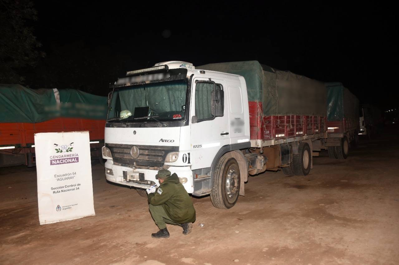 Anoche, efectivos del Escuadrón 54 “Aguaray”, desplegados sobre el kilómetro 1.466 de la Ruta Nacional N° 34, inspeccionan dos camiones con acoplado procedentes de Tucumán, los cuales trasladaban soja partida de consumo animal.