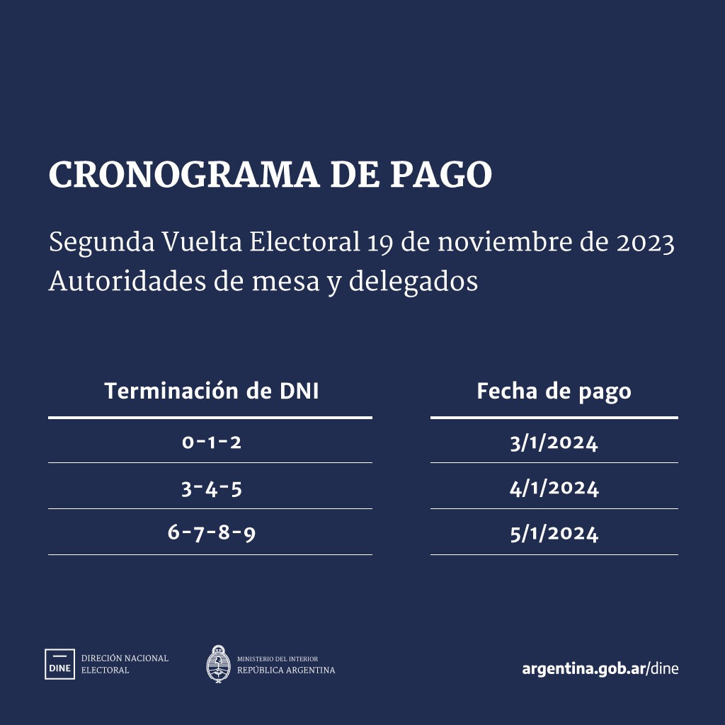 El Gobierno Nacional, a través de la Dirección Nacional Electoral (DINE), da a conocer el cronograma de pago correspondiente a los conceptos de viático y capacitación para quienes se desempeñaron como autoridades de mesa y delegados de la Justicia Nacional Electoral en la segunda vuelta electoral del 19 de noviembre último.
