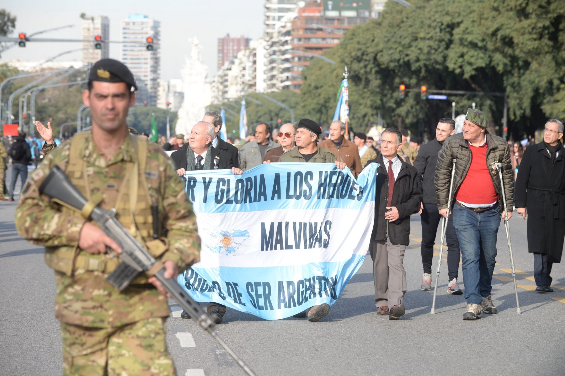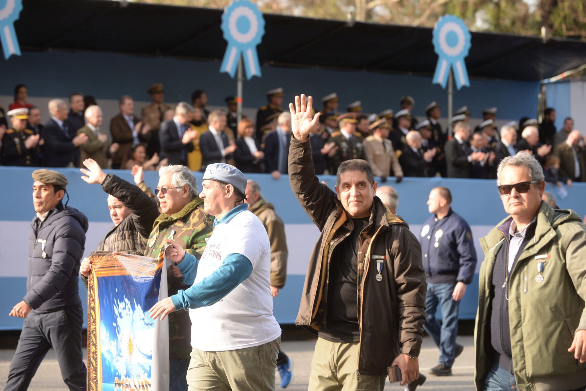 Promediando la ceremonia, desfilaron los Veteranos de la Guerra de Malvinas pertenecientes a las Fuerzas Armadas, acompañados de numerosos aplausos y muestras de cariño del público. Los Veteranos de Guerra del Ejército desfilaron junto a los abanderados que portaban la Bandera de Guerra del elemento con el que acudieron al llamado de la Patria.