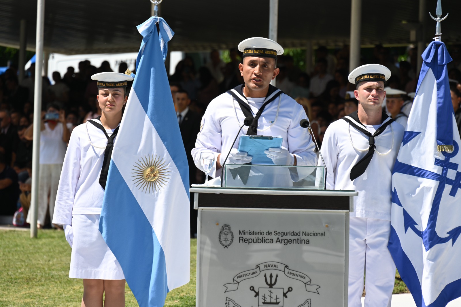 “Desde hoy, lucirán sus insignias con dignidad y profundo sentido de deber, asumiendo la ambición de servir a la comunidad que nos honra con su confianza, y haciéndolo con dedicación, esmero y responsabilidad”, expresó Sánchez, quien instó a los nuevos egresados: “tengan siempre presente que llevan consigo los valores fundamentales que distinguen a la Prefectura: apego a las normas, coraje ante la adversidad, disciplina en cada accionar, honestidad como guía permanente y lealtad como sello indeleble de la profesión”.