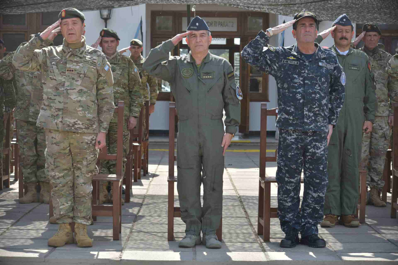 El jefe del Ejército, general de división Carlos Alberto Presti, acompañado por el jefe del Estado Mayor Conjunto de las Fuerzas Armadas, brigadier general Xavier Isaac; el jefe de la Armada, vicealmirante Carlos Allievi, y el subjefe del Estado Mayor General del Ejército, general de brigada Carlos Alberto Carugno, asistió a la ceremonia por la finalización del Curso Básico Conjunto de Formación de Comandos.