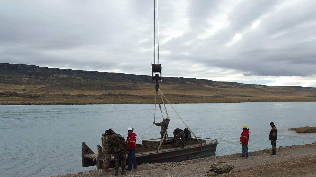 La labor de los ingenieros de Ejército consiste en colocar un puente táctico M4T6 sobre el río Santa Cruz, a unos 200 kilómetros de Comandante Luis Piedrabuena para colaborar con el emprendimiento.