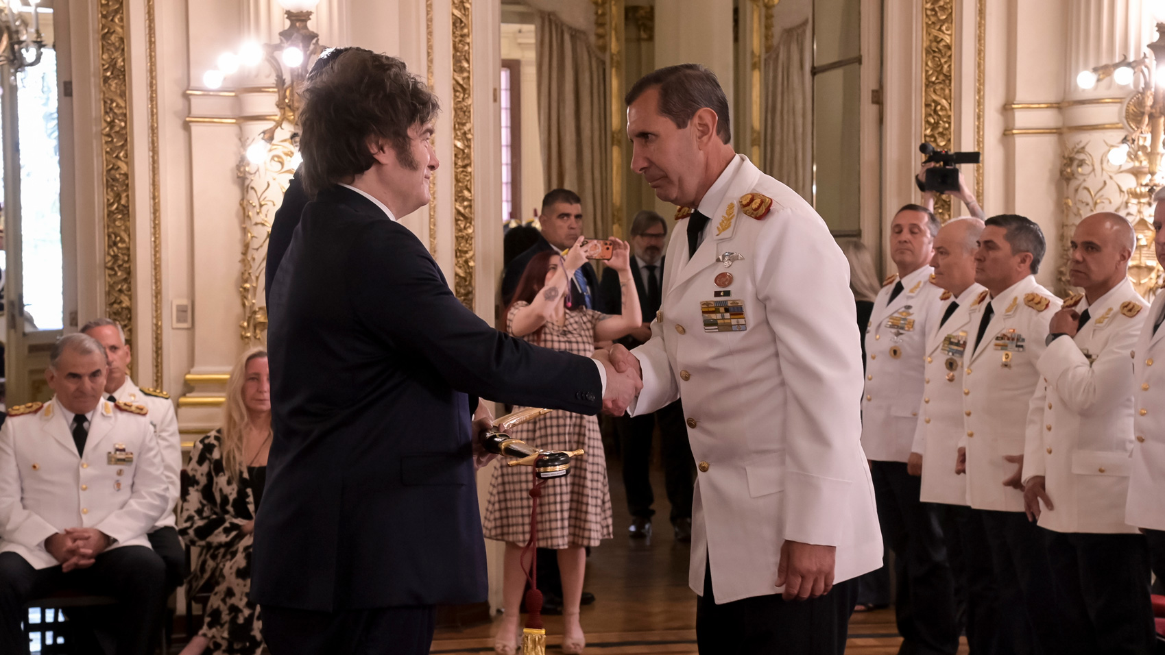 El presidente de la Nación, Dr. Javier Milei, encabezó en el Salón Blanco de la Casa Rosada la ceremonia de entrega de despachos y sables a los generales, almirantes y brigadieres ascendidos en el año.