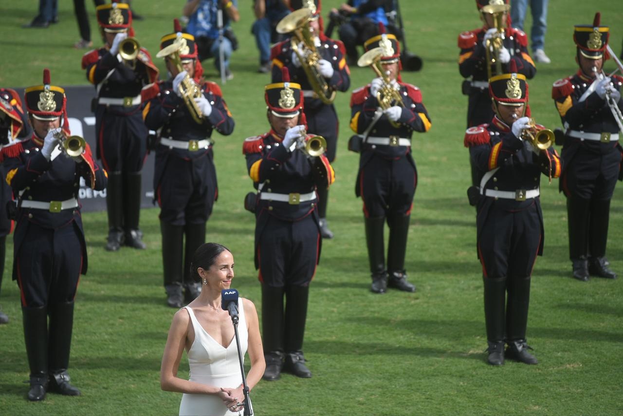 En la previa del partido, el Regimiento de Granaderos a Caballo entonó el Himno Nacional.