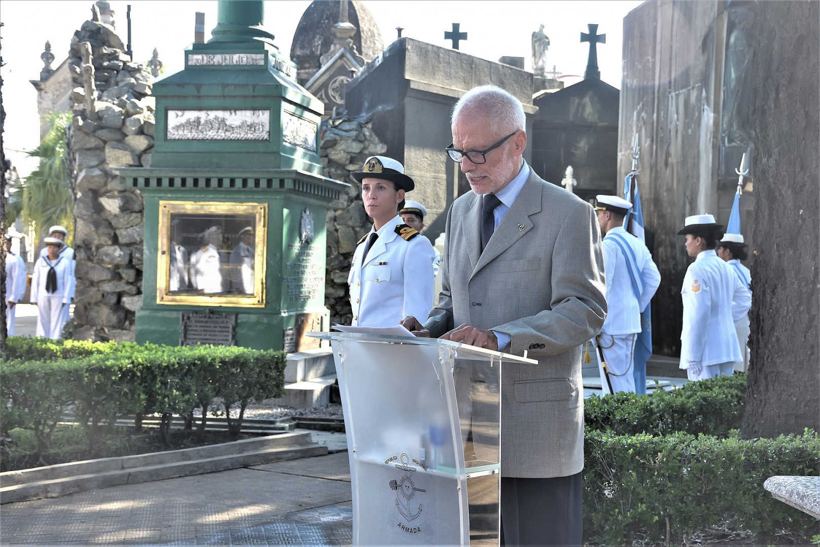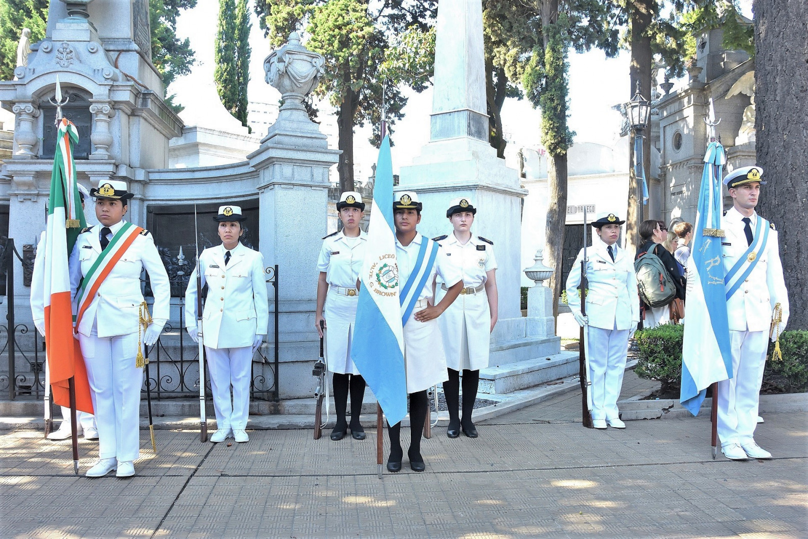Seguidamente, frente el mausoleo que guarda los restos del Almirante Brown, declarado Monumento Histórico Nacional en 1946, se colocaron ofrendas florales en nombre de la Armada Argentina, el Instituto Nacional Browniano y la Embajada de Irlanda.